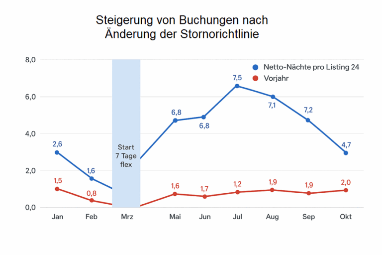 Je flexibler die Stornierungsrichtlinie, desto größer die Chance, dass Ihre Unterkunft gesehen und gebucht wird. Das zeigt auch das Diagramm: Nach Umstellung auf eine flexible Stornierungsrichtlinie sind die Buchungen deutlich gestiegen.
