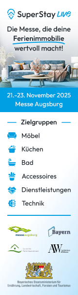 Die Super Stay LIVE in Augsburg ist der Treffpunkt für für Expertinnen, Experten und Interessierte aus der Ferienwohnungsbranche. Auch wir sind vom 21. bis 23. November 2025 wieder mit dabei. Seien Sie dabei – bei dem wichtigsten Event für alle, die in der Ferienwohnungswelt zuhause sind!